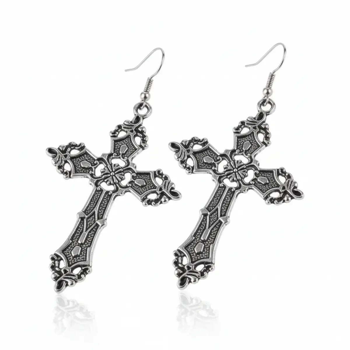 Big Cross Earrings are large silver zinc alloy ornate cross dangles with intricate filigree detailing and an antiqued finish for bold, vintage‑gothic statement wear.