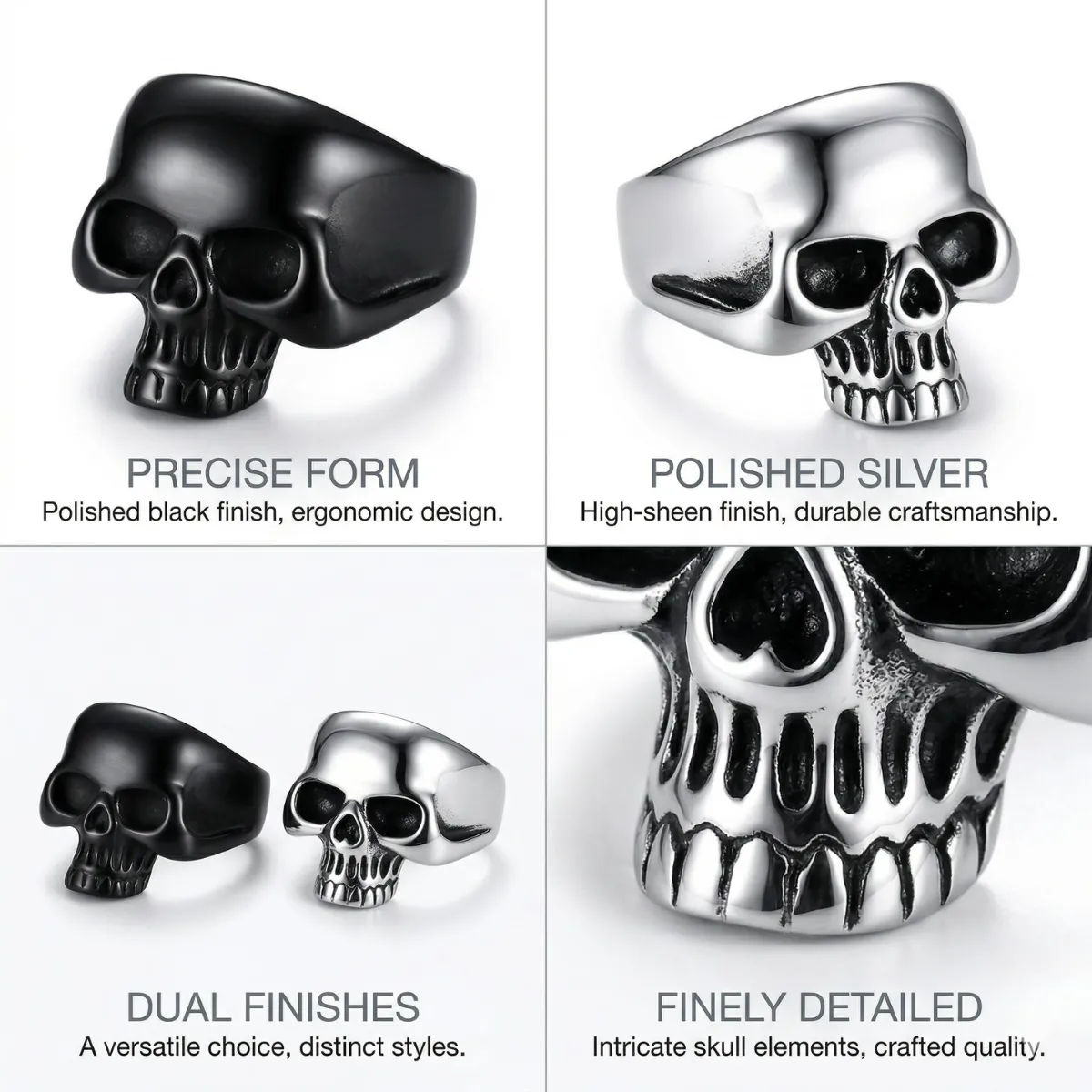 The Half Jaw Skull Ring features a striking, high-polish half-skull design with deep-set eye sockets and detailed upper teeth, tapering smoothly into a solid, ergonomic band to create a bold, asymmetrical silhouette.