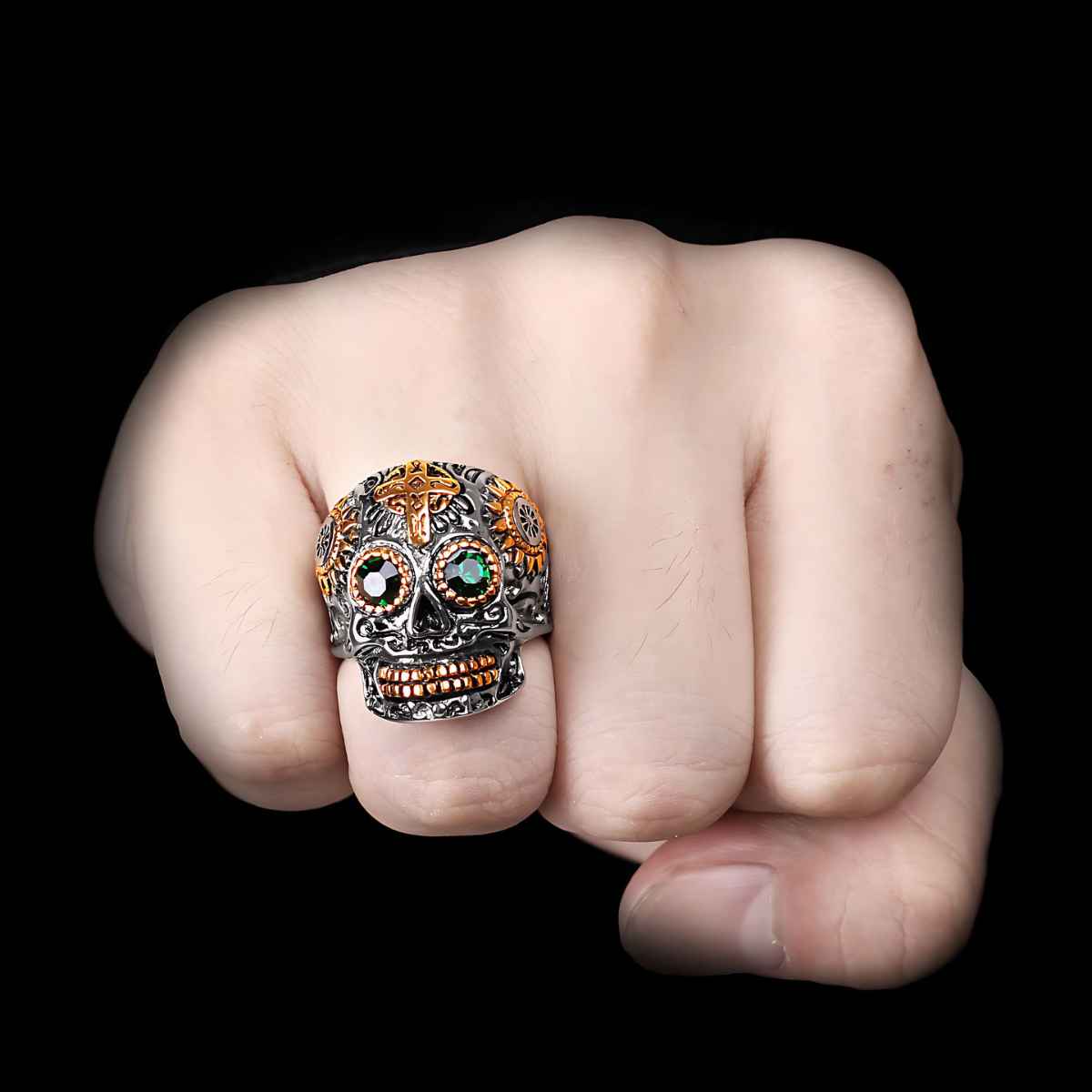 Dive into the vibrant world of cultural artistry with our Sugar Skull Ring, a unisex piece crafted from durable stainless steel. This ring features a stunning green gemstone set in the eye of an intricately designed sugar skull, commonly known as a calavera.