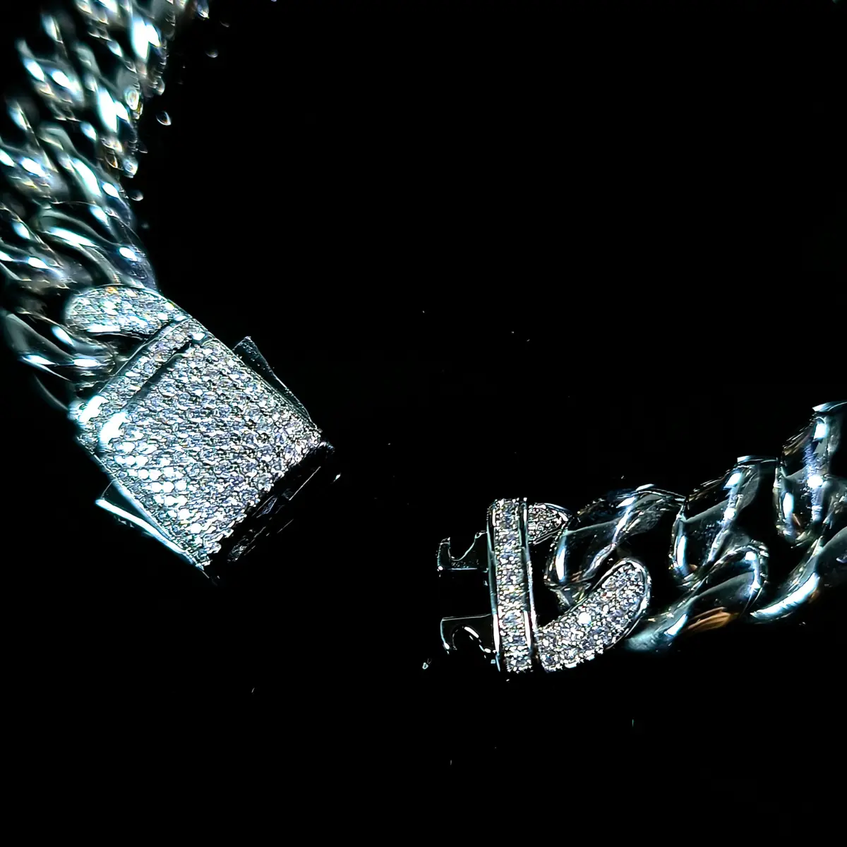 The Cuban Link Bracelet CZ Silver 12mm is a striking statement piece designed for men, featuring robust links polished to perfection. The design showcases a stunning 12mm wide silver link chain that radiates sophistication and strength. The bracelet's front side features elegant round cubic zirconia clasp, ensuring a sparkling finish that complements its bold silhouette.