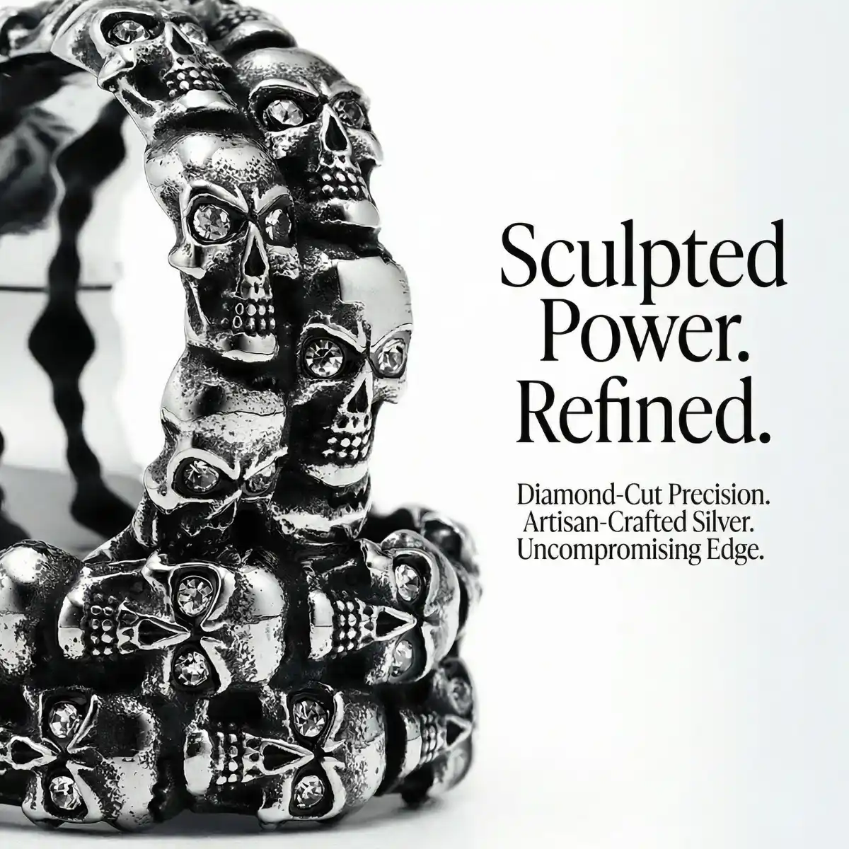 The Double Row Skull Ring makes a striking statement with a seamless 360-degree continuous motif. The band features two parallel, interlocking rows of meticulously carved skulls wrapping entirely around the finger, creating a bold, stackable silhouette without the need for multiple rings. Style A presents a rugged aesthetic with deeply oxidized eye sockets for high contrast, while Style B elevates the design with precision-set crystals in the eyes for a brilliant, catching sparkle. Finished in an antique silver tone to highlight every sculptural detail, the ring is completed with a polished interior that mirrors the subtle undulating shape of the skulls, ensuring a comfortable fit for daily wear.