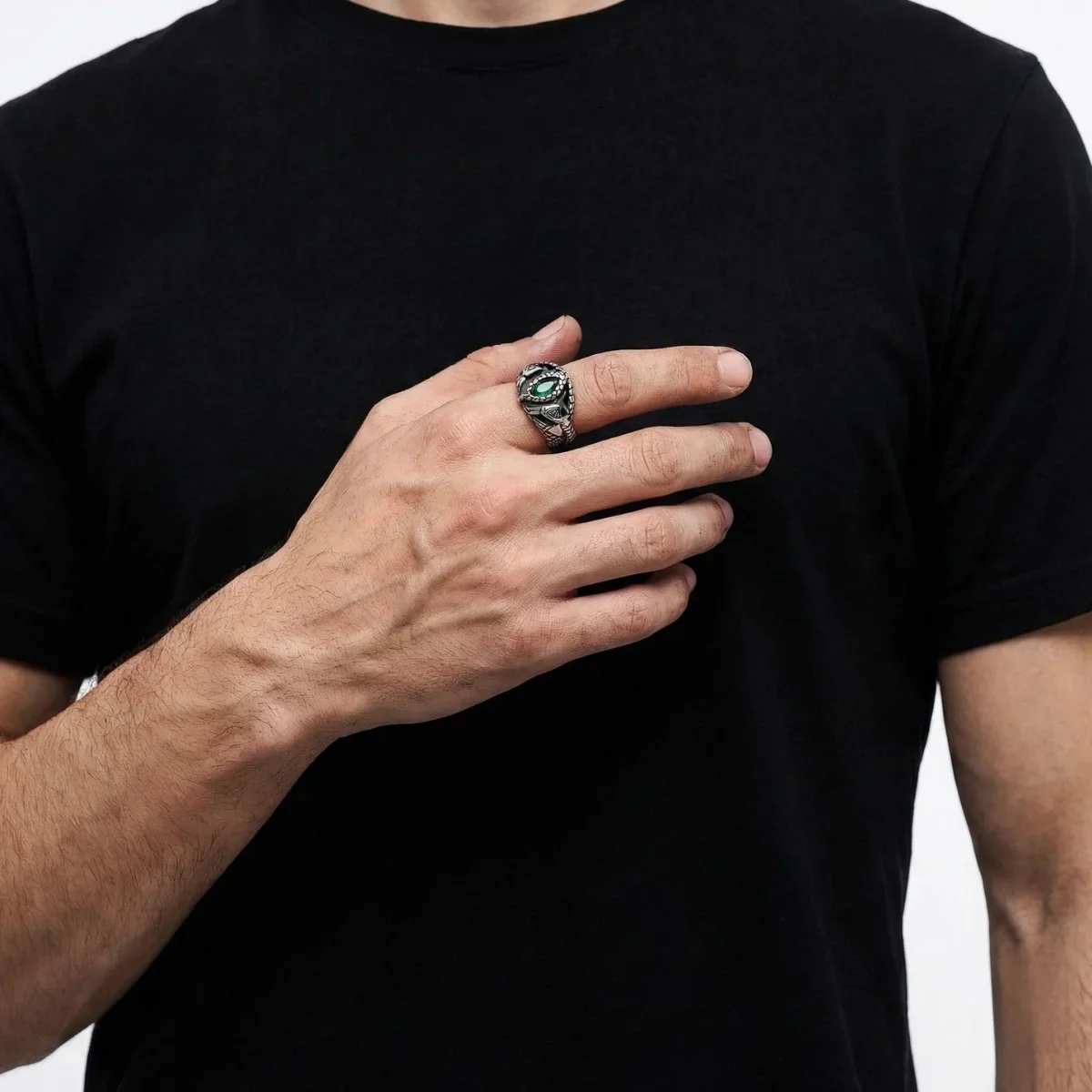 The Aragorn Ring of Barahir features a captivating marquise-cut green center stone embraced by twin intertwined serpents and golden crown accents on the front, transitioning into a meticulously woven back band to create a legendary, high-fantasy silhouette.
