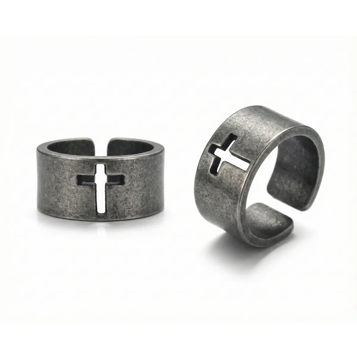 The Simple Cross Band Ring is a rugged, minimalist accessory crafted from premium stainless steel, featuring a distinct negative-space cross cutout set within a wide, textured antique silver band. This open-back ring offers an adjustable fit and showcases a durable, matte-finished silhouette that combines industrial edge with a classic geometric motif, making it a versatile addition to any everyday jewelry rotation.