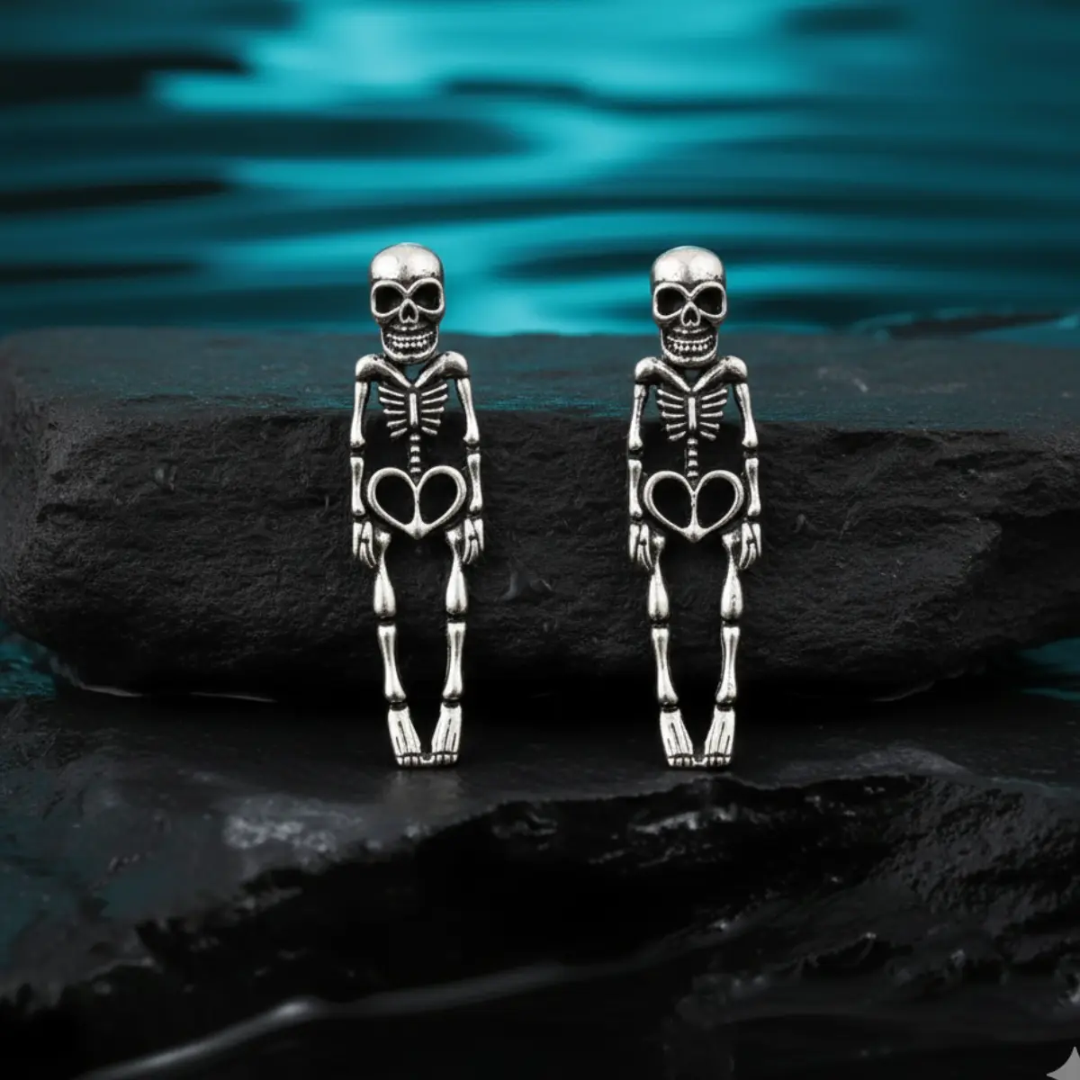 - Craftsmanship: Sculpted skeleton design with detailed ribcage and limbs, hollow heart-shaped pelvis accent, polished plated finish, secure post and butterfly backs for lightweight, comfortable wear